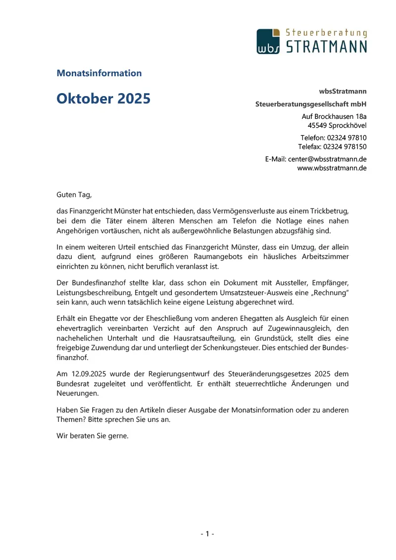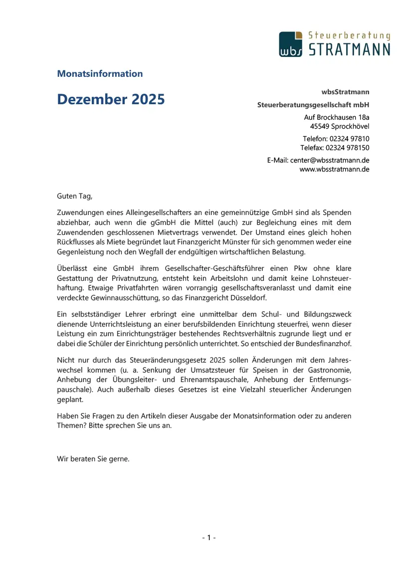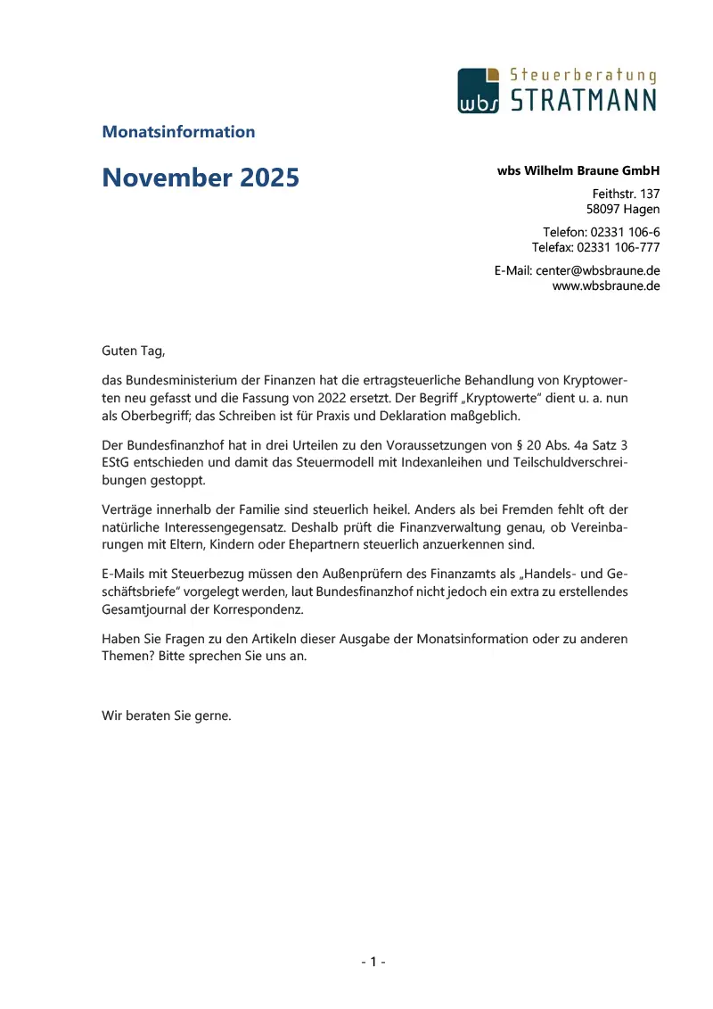 Hier finden Sie jeden Monat aktuelle Informationen zum Steuer- und Wirtschaftsrecht